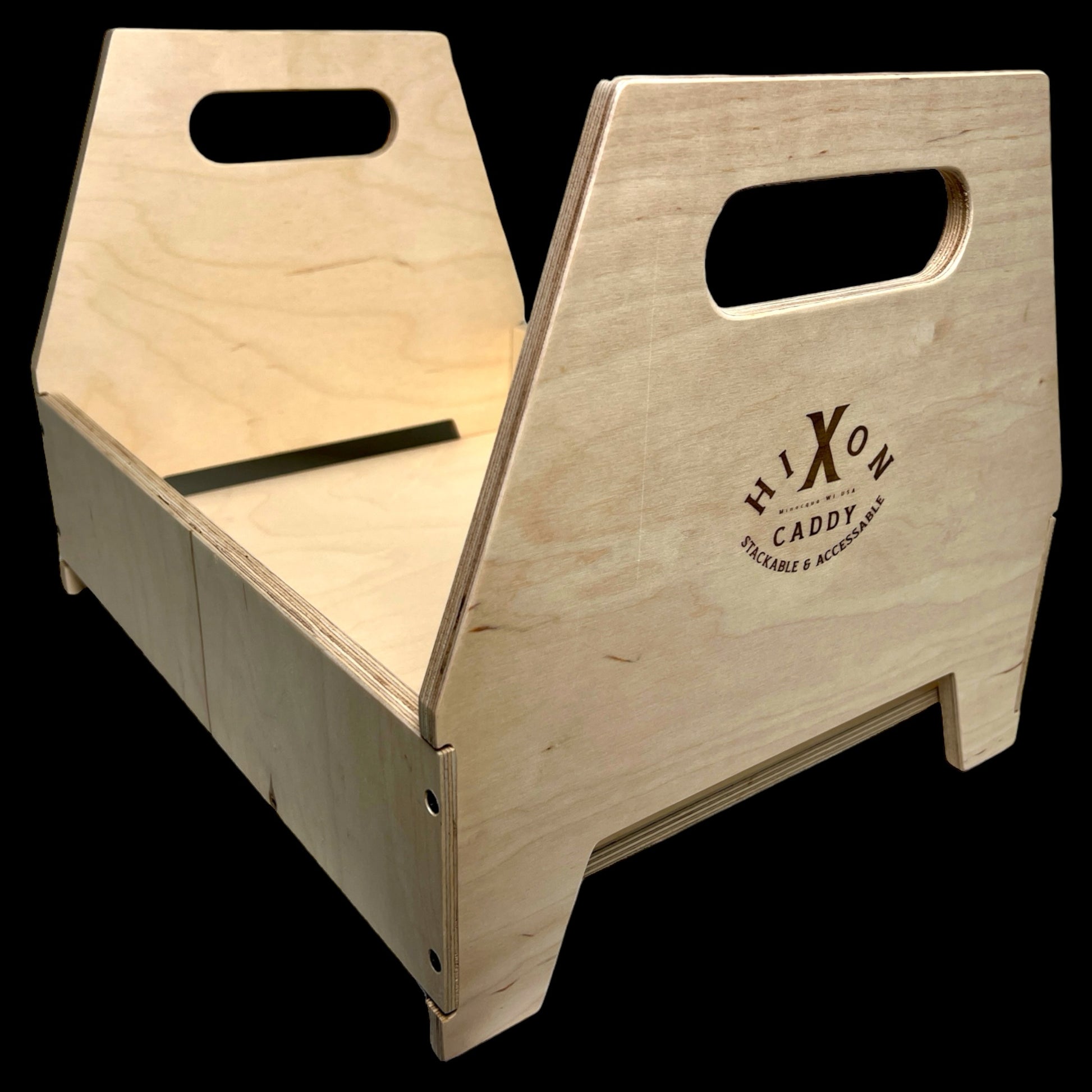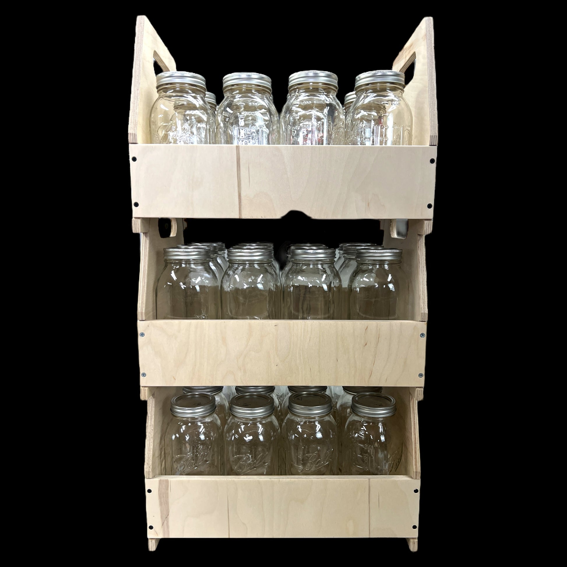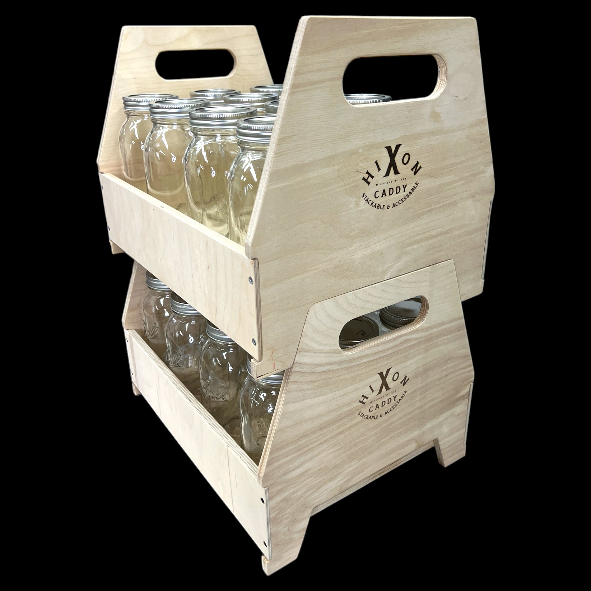 A quality, stable and durable caddy for carrying and storing. Its innovative design allows for accessing your goods while stacked on top of each other without having to unstack and restack. Originally designed to hold a case of quart jars it can accommodate most anything you would want to store. This caddy system acts as is own shelving unit and increases your storage space by allowing a decorative option you would be proud to display. Standard caddies hold 12 Quart jars / 15 Pint jars / 6- 1/2 Gallon jars.